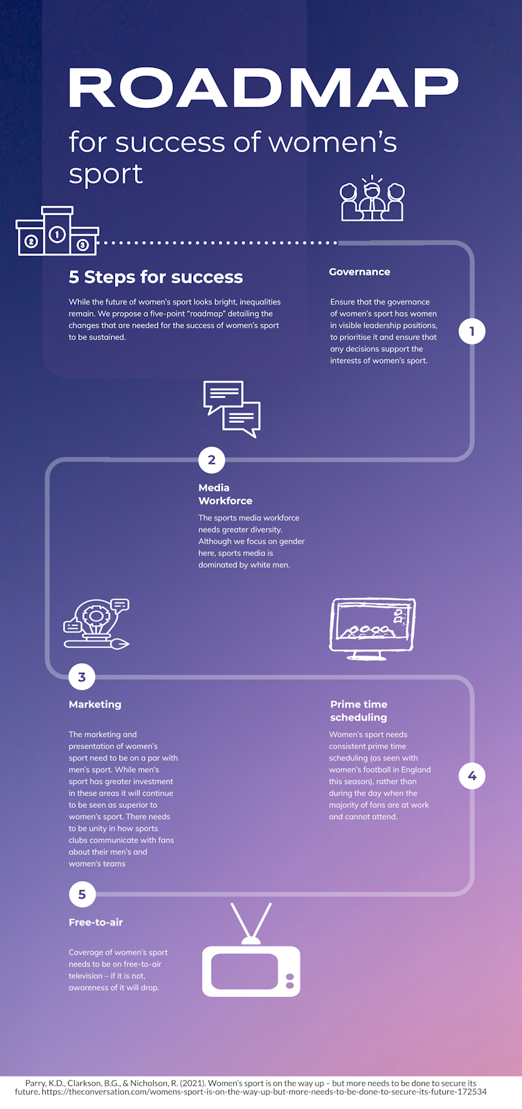 Recently, my colleagues and I mapped out five actions needed to make sure that recent gains for women’s sport are not lost, see below. With changes in society, widespread support for gender equality, and the current popularity of women’s sport, now is the time to act on these changes to ensure that it is not another 100 years before we see the recent attendance records broken. Gender equality is a societal goal and it should be in sport too.