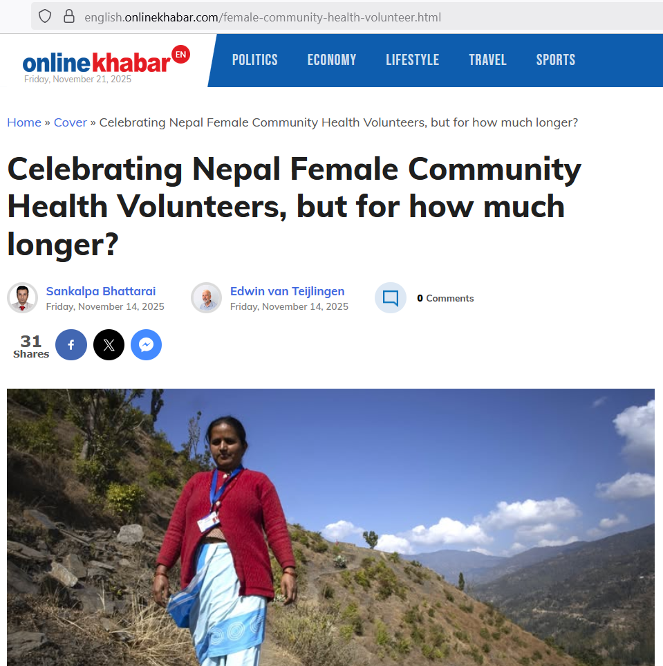 The online newspaper article is based on a paper we published last year as a Commentary in the Journal of Manmohan Memorial Institute of Health Sciences [1]. Our previous research work on FCHVs included a paper in PLOS Global Public Health [2], as well as two further papers based on the Ph.D. study by Dr. Sarita Panday [3-4].
