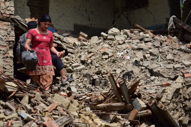 A woman on a collapsed building in Kathmandu after the earthquake in May, 2015. Shutterstock/Somjin Klong-ugkara