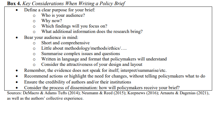 - van Teijlingen, E., Balen, J., Regmi, P., Rushton, S., Simkhada, P., Aryal, N. (2025). Bridging Research and Policy: Practical Tips for Writing Policy Briefs. Journal of Health Promotion, 13(1),:89–96. https://doi.org/10.3126/jhp.v13i1.87170