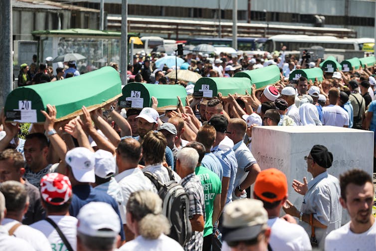 Bosnian Muslims carry coffins with remains of Srebrenica victims, 2017. EPA/Jasmin Brutus