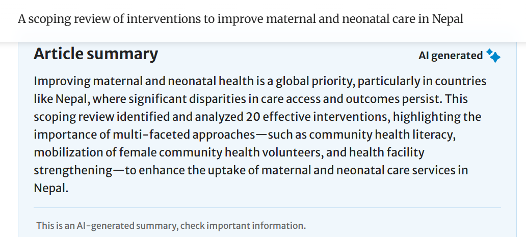 - Wasti, S.P., van Teijlingen, E., Adhikari, N. Morgan, J. (2025) A scoping review of interventions to improve maternal and neonatal care in Nepal. Discover Public Health 22, 855 . https://doi.org/10.1186/s12982-025-01241-x